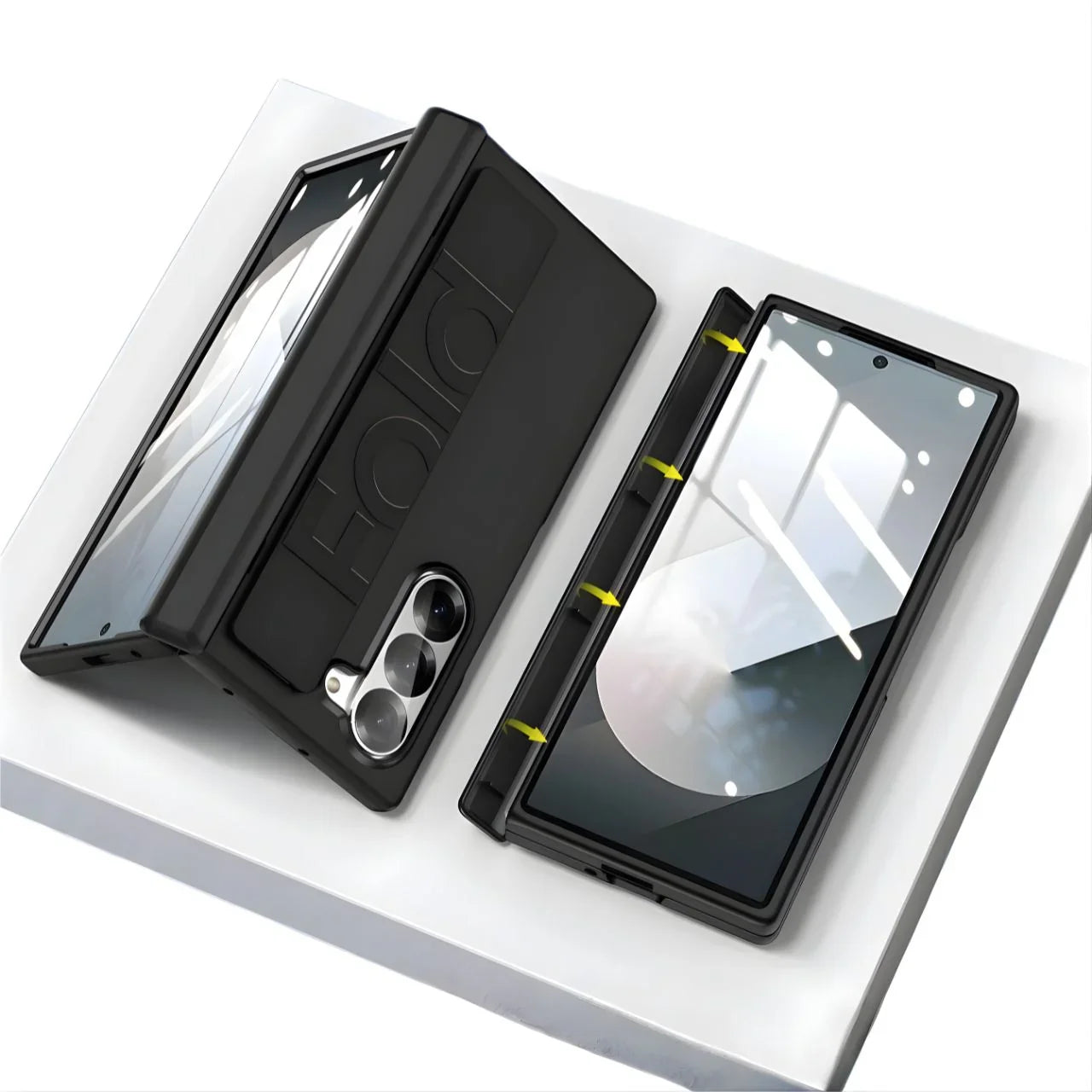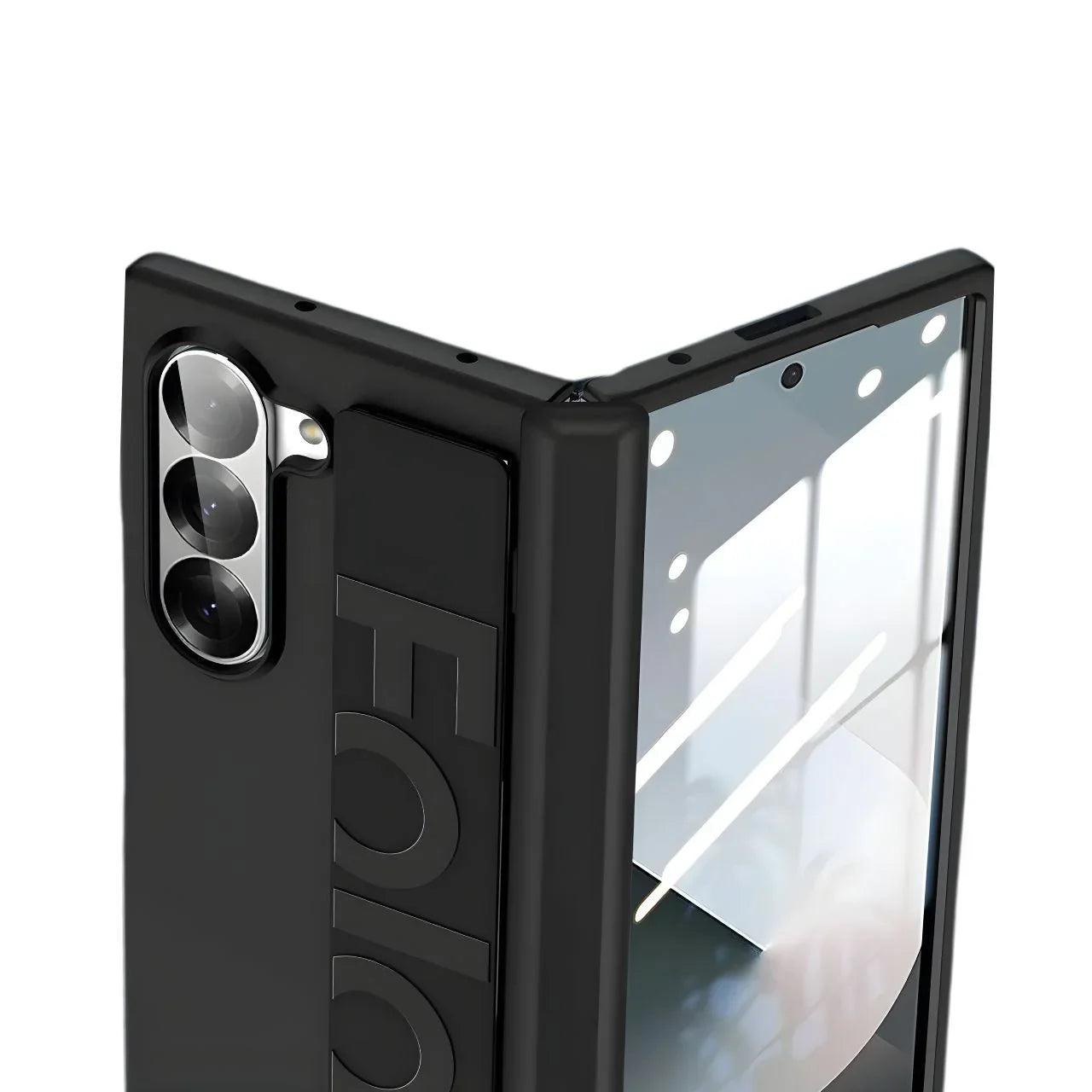 Protect your Galaxy Z Fold from all angles. Featuring a robust PC hard shell, vital hinge protection, and an integrated soft wristband, this case offers thoughtful, multi-faceted security.
